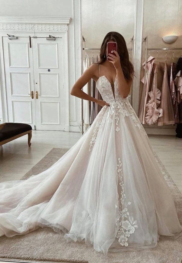 A-Line Spaghetti Lace Long Prom Dresses, Formal Evening Dresses
