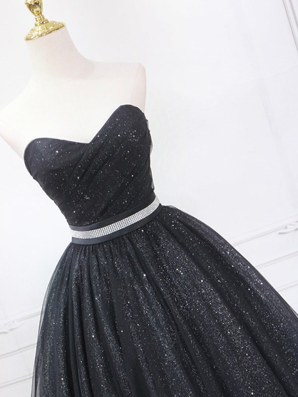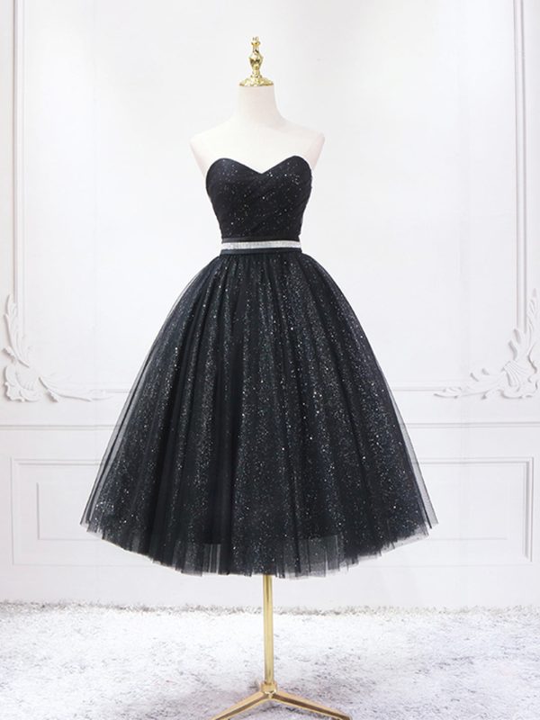 Black Shiny Tulle Tea Length Prom Dress, Black Strapless A-Line Party Dress