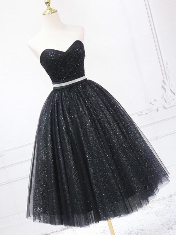 Black Shiny Tulle Tea Length Prom Dress, BlackStrapless A-Line Party Dress